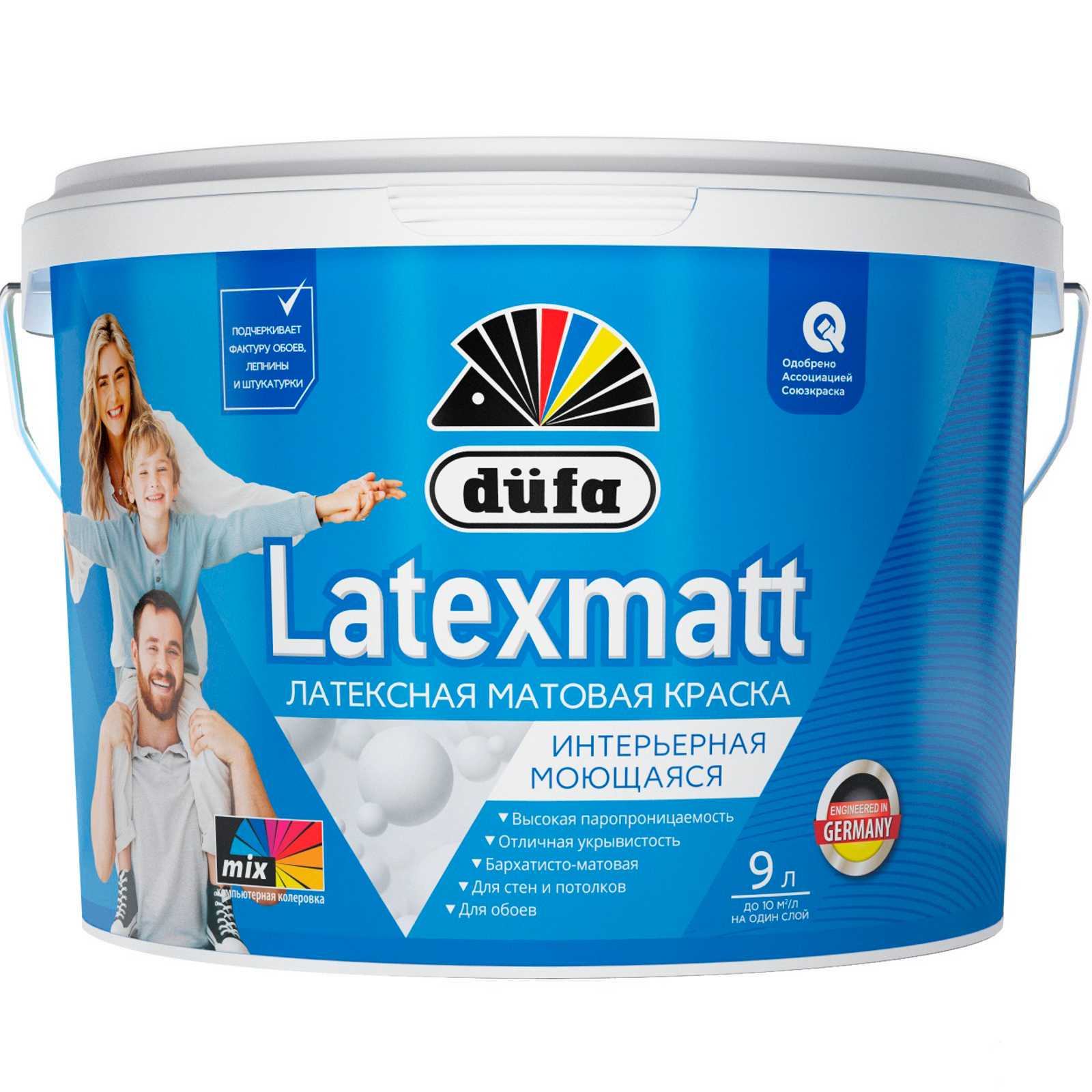 Латексная матовая краска для окраски стен и потолков внутри сухих помещений и помещений с умеренной влажностью, а также для перекрашивания прочных старых покрытий. Предназначена для окраски по различным видам оснований: штукатурка, бетон, кирпич, гипсокартонные плиты, стеклообои и фактурные обои под покраску. Рекомендуется для помещений со средней эксплуатационной нагрузкой (квартиры, дома, офисы, кафе, лестничные пролёты, коридоры, холлы). Сертифицирована для применения в детских и медицинских учреждениях.